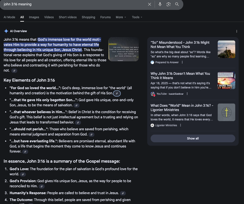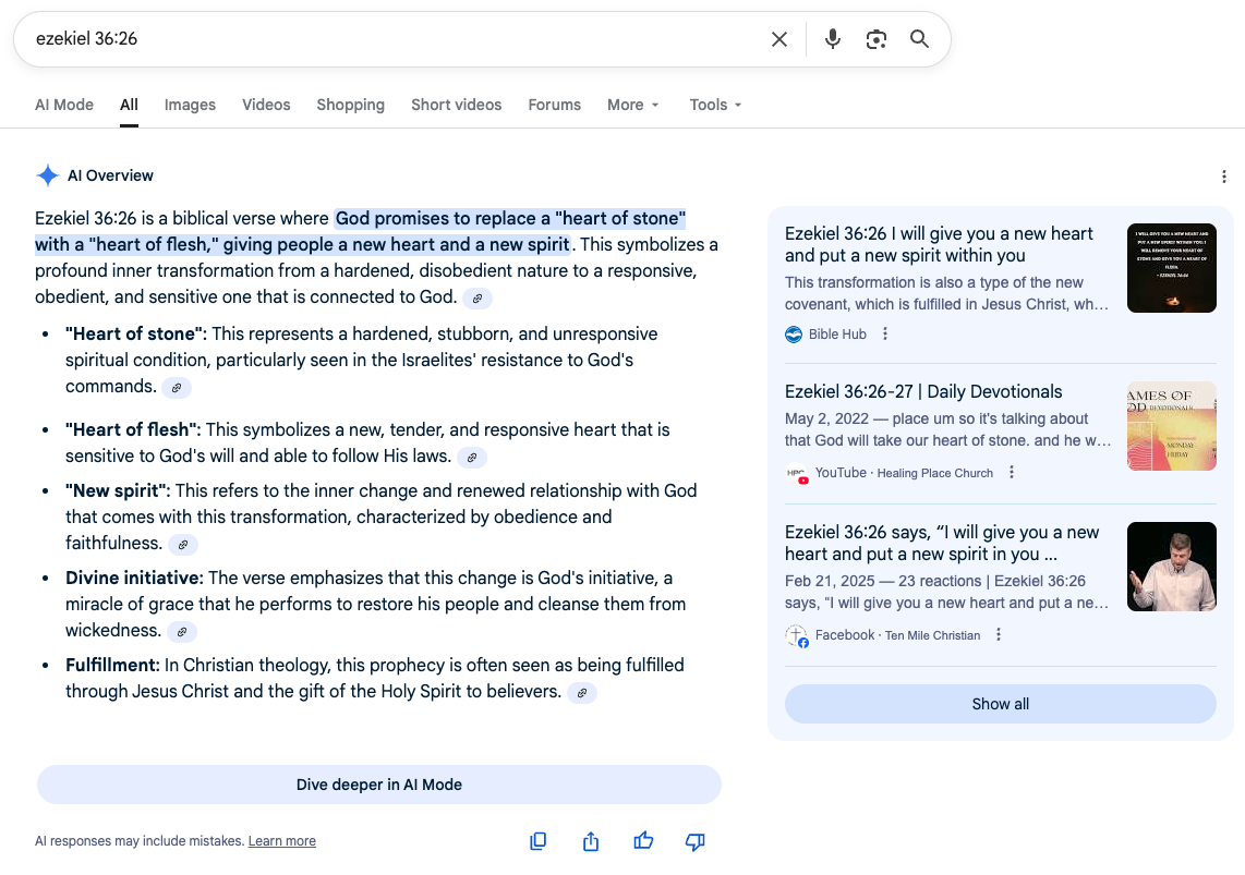 You don't have to publish content on your website to show up in AI Overviews. When I googled one of my favorite verses, the top 3 results consisted of YouTube and Facebook (which surprised me). As of July 2025, Facebook and Instagram posts became searchable by Google.