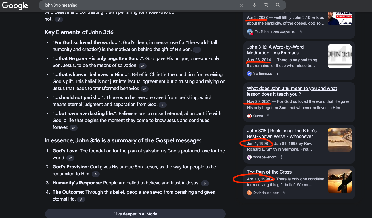 The dates range from January 1, 1998, to April 2025. I'm not saying that if you published a piece of content for "What does John 3:16 mean?" that it would rank. But I am saying that the newness can matter.